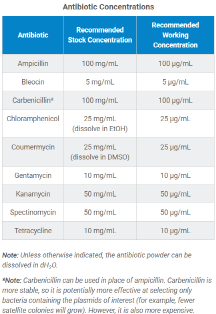按照适当浓度添加抗生素。具体用量见下表:
