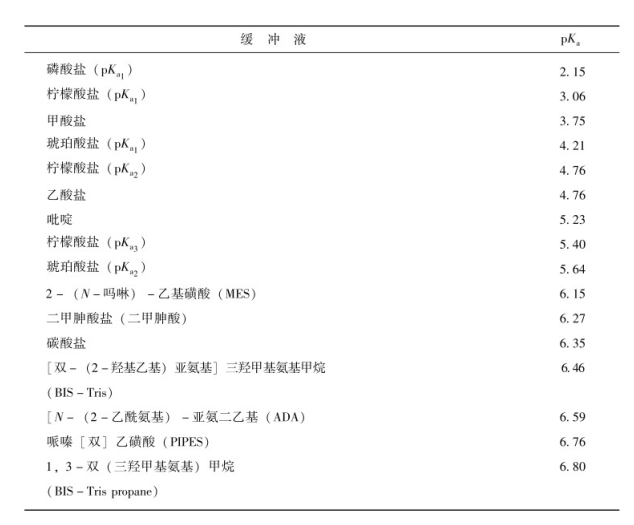 甲酸-甲酸盐缓冲液应用范围很广,因其挥发性强,使用后可以用减压法除去。乙酸-乙酸钠和柠檬酸-柠檬酸钠缓冲体系的使用也较多,柠檬酸有3个pKa值:pKa1=3.10,pKa2=4.75,pKa3=6.40;琥珀酸有2个pKa值:pKa1=4.18,pKa2=5.60。