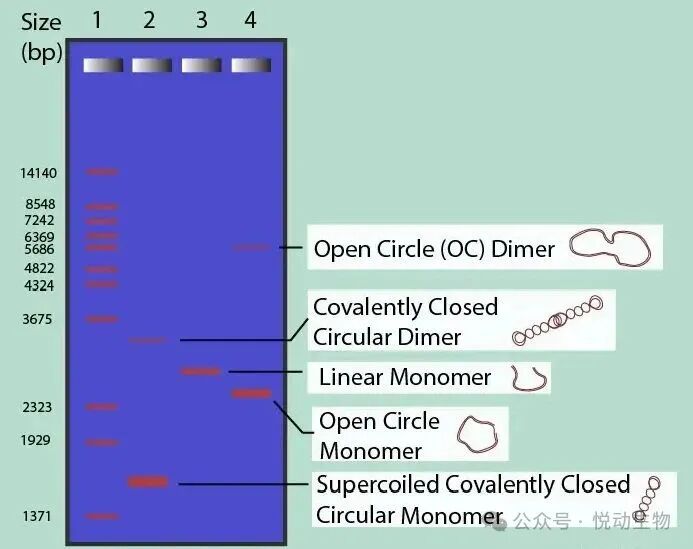 2、DNA分子构型:一般来说,单体超螺旋共价闭合形式比任何其他形式移动更快,因为他们有一个紧凑的超螺旋 DNA 结构。因此,它们会出现在离凝胶上样端的最远处。
