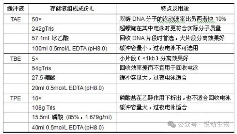 6、电泳缓冲液:目前有3种缓冲液适用于天然双链DNA的电泳:TAE、TBE和TPE,其组成及特点见表2。一般常用的DNA电泳选用TAE较多,其电泳时间较快,而且成本比较低,但是其缓冲容量较低,需经常更换电泳液。